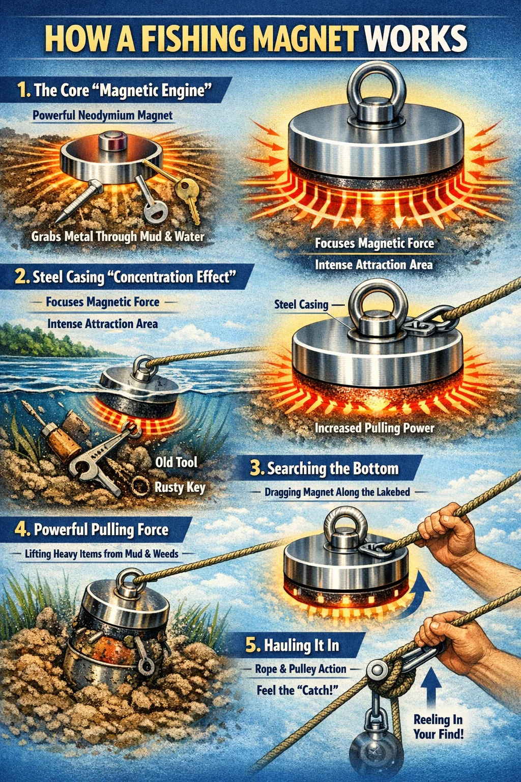 Aby ste pochopili, ako a rybársky magnet funguje, môžete si ho predstaviť ako supervýkonný „podvodný vysávač“, ibaže namiesto prachu nasáva kov.