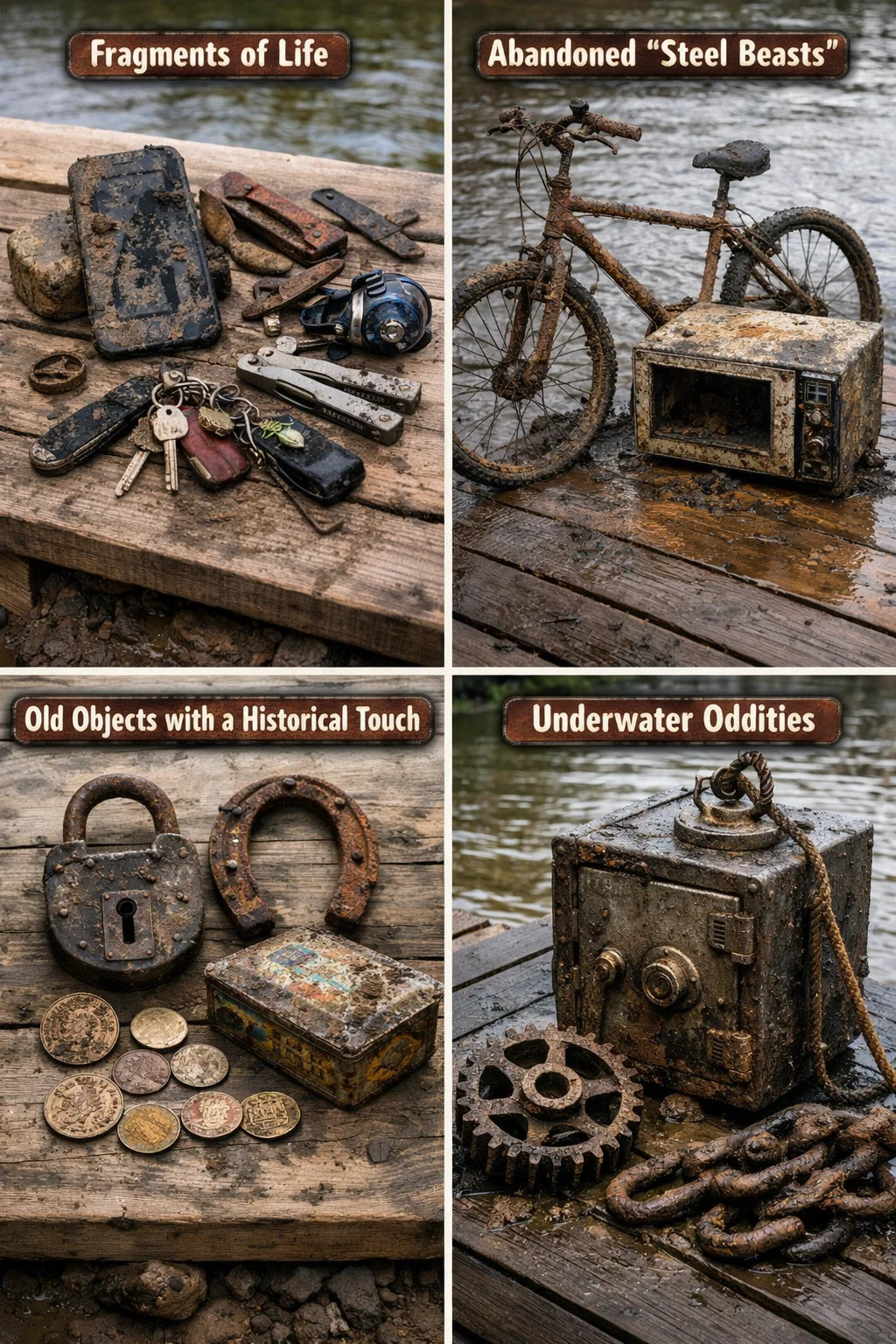 Priemyselné diely: Obrovské ozubené kolesá, hrdzavé reťaze alebo akési súčiastky továrenských strojov, ktorých mená už nie sú rozpoznateľné. Trezory a kovové boxy: Objavenie trezoru je často vrcholom magnetického rybolovu, a aj keď obsahuje iba blato a piesok, pocit úspechu z objavovania neznámeho nemá obdoby.