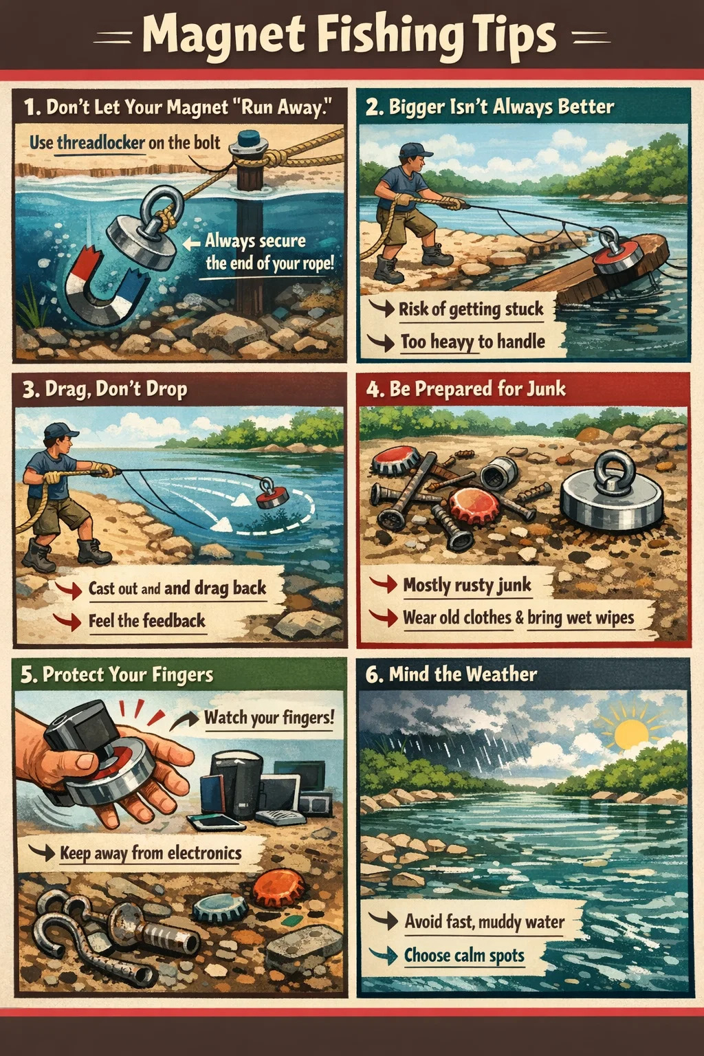 Zaistite koniec lana: Pri hádzaní magnetu musí byť druhý koniec lana priviazaný k vášmu pásu alebo stĺpiku na brehu. Trápna situácia hádzania celého lana do rieky nadmernou silou sa stáva každý deň.