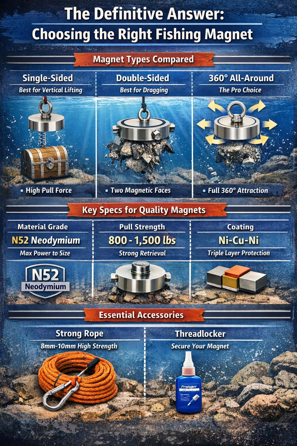 Ak práve začínate, choďte na a obojstranný rybársky magnet kit s hodnotením ťahu okolo 1 200 libier (kombinované) . To vám dáva silu približne 600 libier na stranu, čo je dosť na to, aby ste zdvihli bicykle a náradie bez toho, aby ste boli takí ťažký, že by to bola fuška hádzať. Pre tých, ktorí chcú maximalizovať svoje nálezy v hlbokom bahne, 360-stupňová šelma je nespochybniteľným kráľom koryta.
