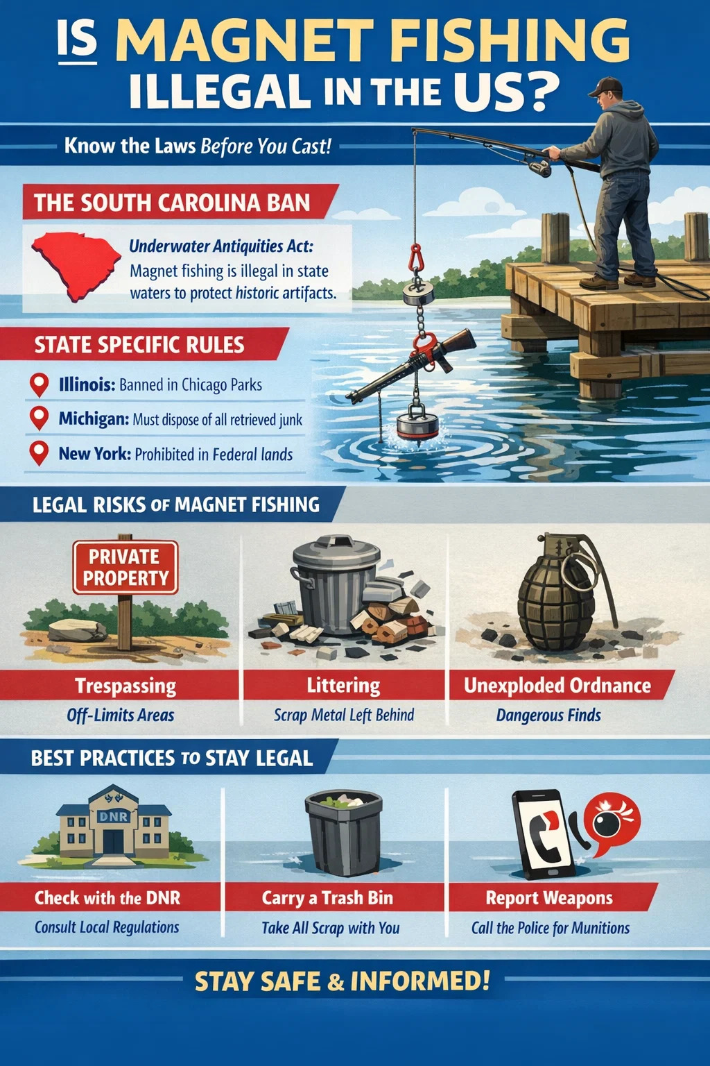 Magnetický rybolov je nie je nezákonné na federálnej úrovni v Spojených štátoch, ale je prísne regulovaný alebo priamo zakázaný v konkrétnych štátoch, mestách a jurisdikciách. Najpozoruhodnejší zákaz je v Južná Karolína , kde zákon o podmorských starožitnostiach zakazuje používanie a rybársky magnet zbierať artefakty zo štátnych vôd. V iných štátoch zákonnosť závisí od miestnych zákonov o prekračovaní, ochrany životného prostredia a mandátov Ministerstva prírodných zdrojov (DNR).